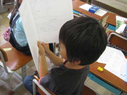 名前を呼ばれたら,先生のところに行きます。先生ががんばったことを褒めてくださいました。自分の席に戻ったら,もらった通知票をそっと開けます。さあ,どうだったかな?