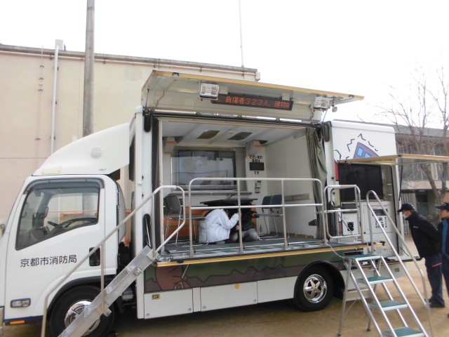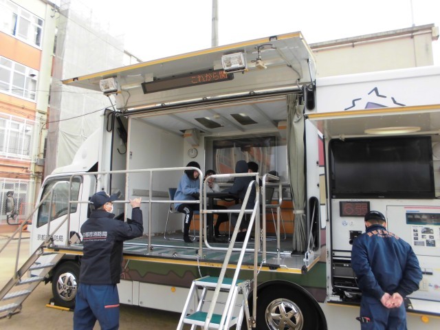 今日は、避難訓練の後に起震車体験を行いました。班ごとに起震車に乗り、震度5~7の揺れを体験しました。「揺れ始めたら机の下に入り、頭を守る」ということは、みんな分かってはいましたが、実際に強い揺れの中動くのが難しい様子でした。起震車の机は、固定されていたので動かなかったですが、実際の机はどうかな…と考えた時、「机も吹っ飛んで行っちゃうやん。」という声も。体験後のふりかえりの時間では、「だからこそ、どんな状況でもとりあえず頭はしっかりと守らないと。」とみんなで再確認しました。