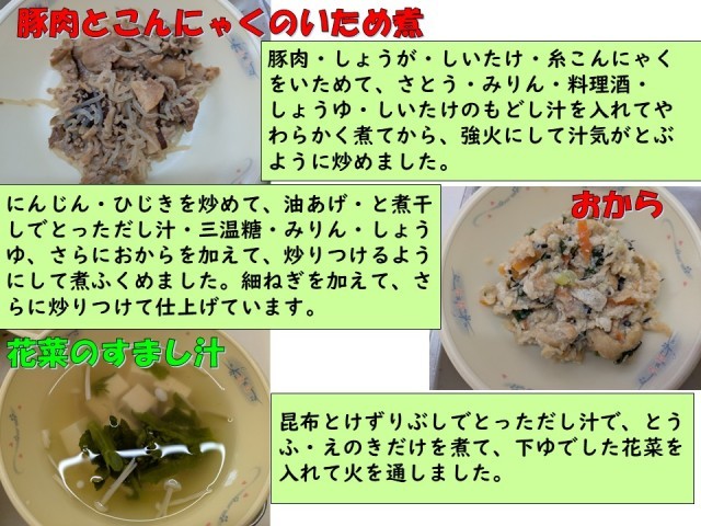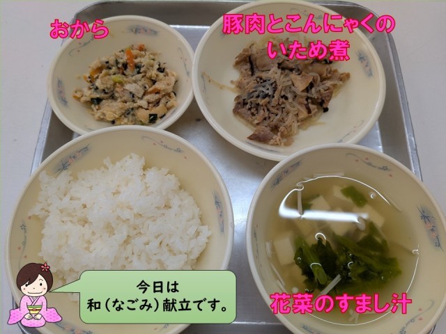 今日の献立は、「ごはん・豚肉とこんにゃくのいため煮・おから・花菜のすまし汁」でした。今日は2月の和(なごみ)献立です。煮干しや、けずりぶし・昆布でとっただしや、旬の細ねぎ、同じく旬の京野菜、花菜を使いました。