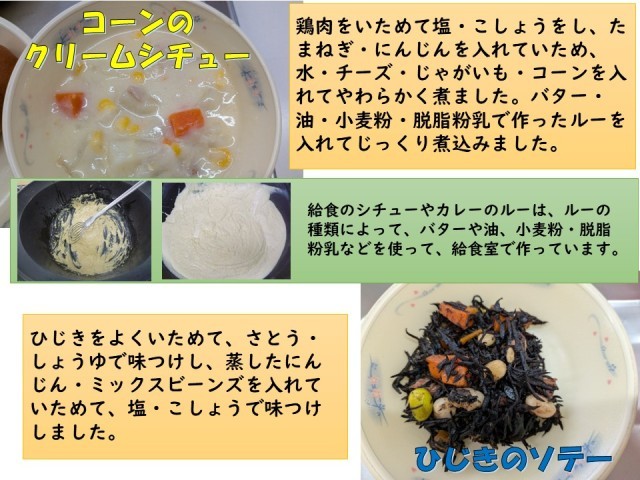 コーンのクリームシチューは、甘みのあるコーンが入ったシチューです。コーンと一緒に鶏肉やたまねぎ・にんじん・じゃがいもも入っています。鶏肉・たまねぎ・にんじんをいためた後、水・チーズ・じゃがいも・コーンを入れてやわらかく煮て、ルーを入れてさらにじっくり煮込みました。ルーは給食室で作っています。ほくほくのじゃがいもなどにルーがからんだシチューは子どもたちに大人気です。
