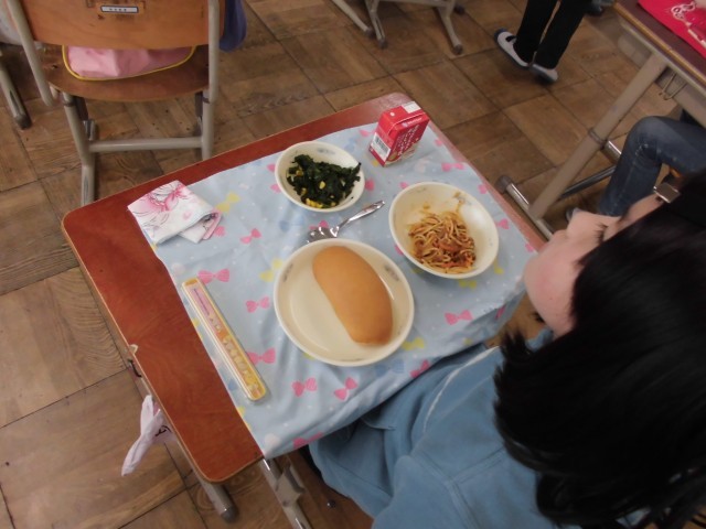今日から給食が始まりました。3時間目ぐらいになると「お腹が減った」と言っていました。今日のメニューは【小型コッペパン・牛乳・スパゲッティのミートソース煮・ほうれん草のソテー】です。おいしくいただきました。