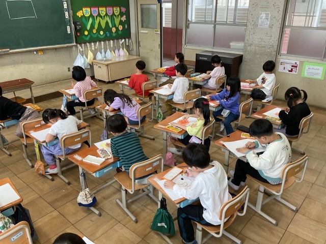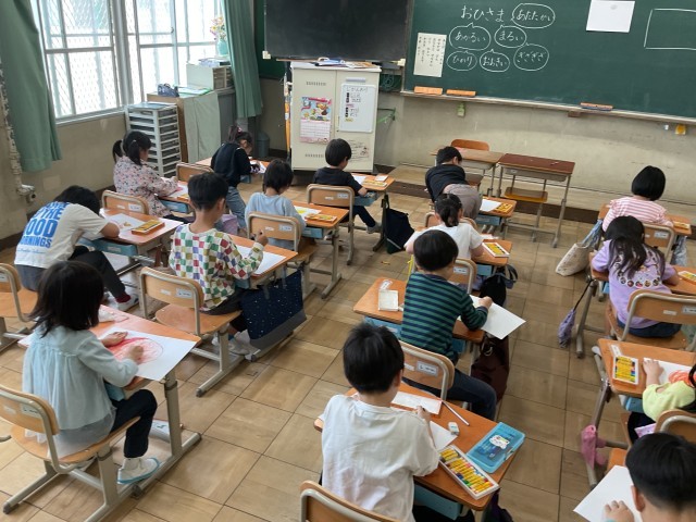 1年生の図画工作科では、クレパスを使っておひさまを描きました。「おひさまってどんな感じ?」と尋ねると、「あかるい」「ひかっている」「あたたかい」などさまざまなイメージをふくらませていました。明るい色を使って、思い思いのおひさまを表現することができました。