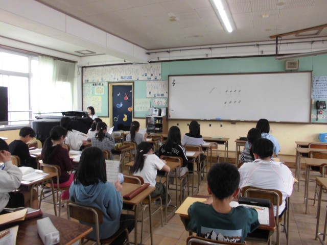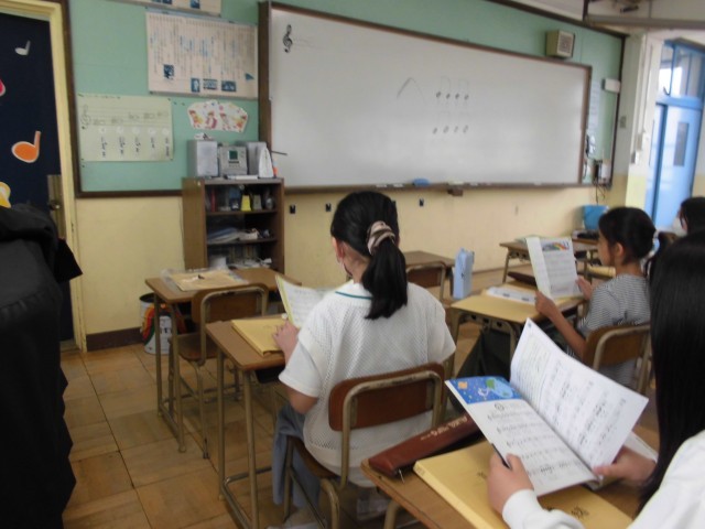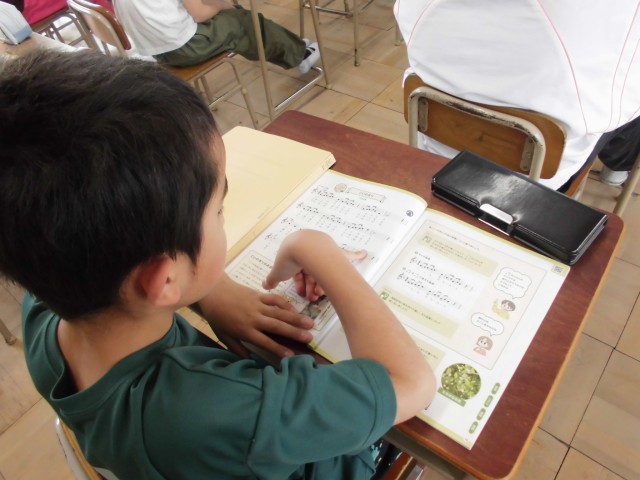 音楽の学習で『すてきな一歩』と『こいのぼり』を歌いました。『すてきな一歩』は二部合唱で歌いました。『こいのぼり』は幼稚園や保育園で歌ったのとは違うので驚いてはいました。ピアノに合わせて歌っていました。