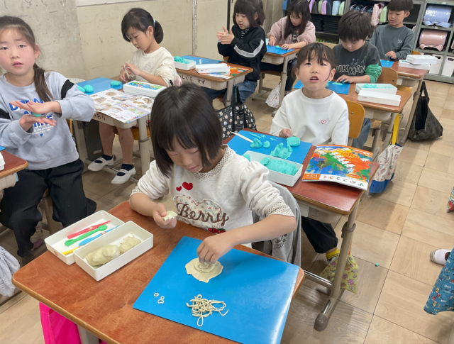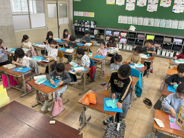 「いろいろなにぎり方を使って、つくりたいものをつくろう」というめあてをもち、それぞれがねん土で表したいものをイメージしながら作りました。