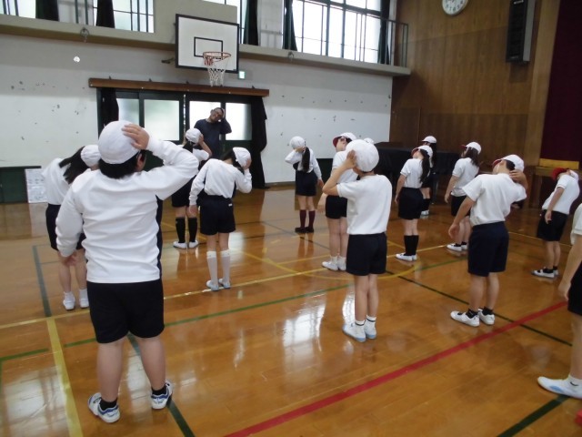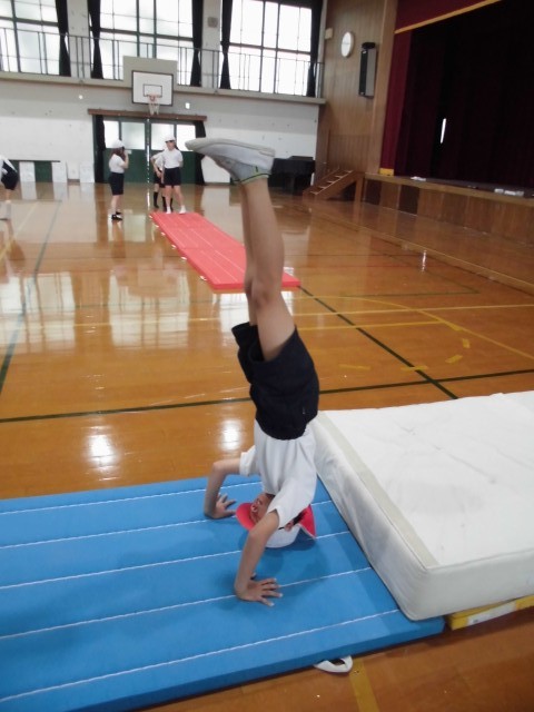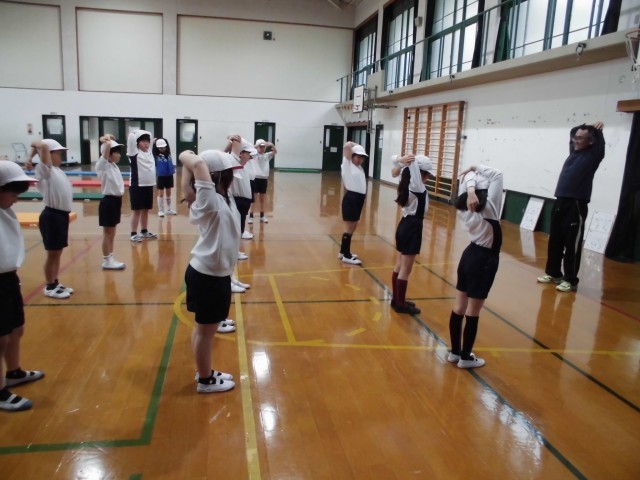 しっかりストレッチをして、首や腕を伸ばしてからマット運動に取り組みました。