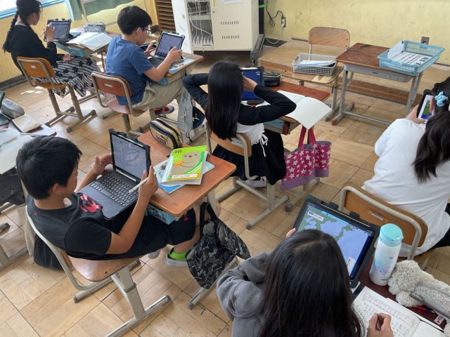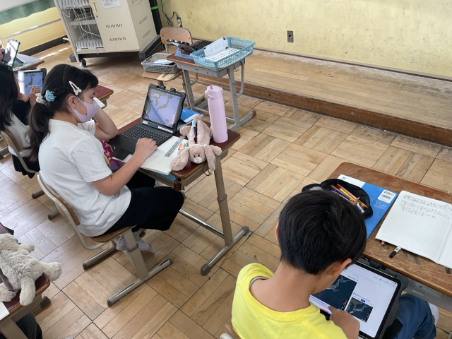 タブレットを使い、日本全体の雲の動きや天気の変化を観察し、二つを見比べることで雲が多い地域は雨が降っていることに気づきました。