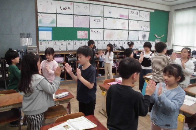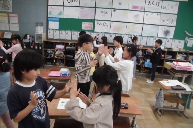 3年生 音楽 「音楽で心をつなげよう」 公開日 2026/04/28 更新日 2026/04/28 3年担任から 音楽の学習では、「茶つみ」で手遊びをしました。曲の感じに合わせて、友達と楽しく交流し、心を通わす姿が見れました。