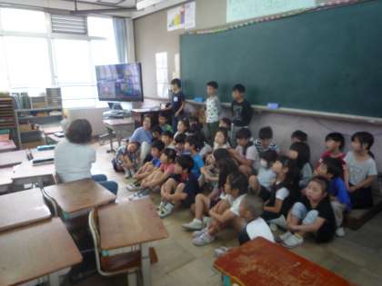 残念ですが雨のために遠足に行けません。先生が本を読んでくれました。「トトシュときんぎょのじゅもん」です。子ども達はどんどん本の世界に入っていきます。