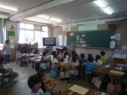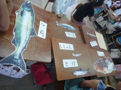 栄養教諭の樋口先生が教室に実際の大きさの魚カードを持って