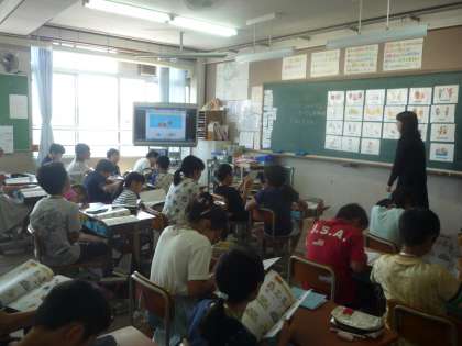 ALTのメリッサ先生と一緒に外国語活動の学習をしています。