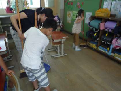 1年生の教室です。ほうきの持ち方や机のひき方など掃除のやり方を教えてもらい,1年生も掃除をしています。上手になってきました。