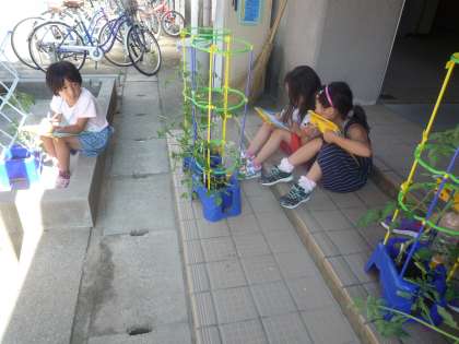 この暑さ。そして,梅雨の雨。ミニトマトはどんどん大きくなってきています。生活科の学習で観察と記録をしました。