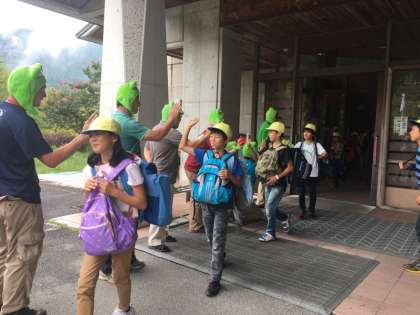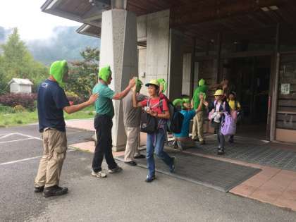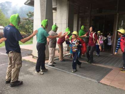 お世話になった先生方とハイタッチをして,花背山の家とお別れしました。