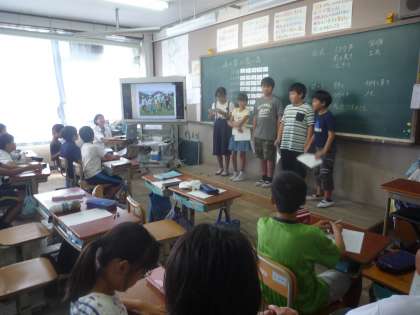 花背山の家での活動を振り返り,グループごとに楽しかったことや協力をしたこと,心に残ったことなどを写真を見ながら発表しました。