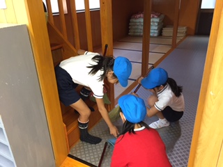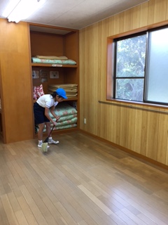 朝の集いの後は,おそうじをしました。自分たちの使った場所を,「来た時よりも美しく」できるよう頑張りました。写真は,女子が泊まったバンガローをそうじしている様子です。