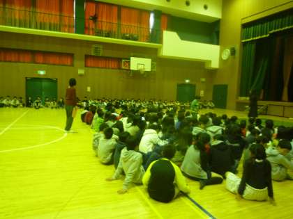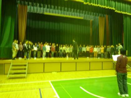 今日は洛陽総合高校の体育館をお借りして,練習を行いました。3年生と6年生が歌声を聴きにきてくれました。