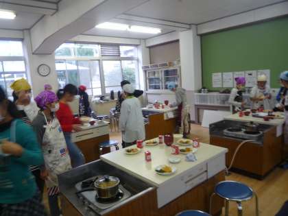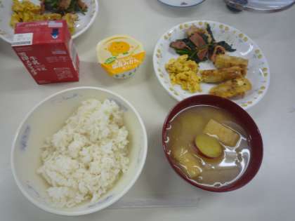 2班 ちくわのピカタとほうれんそうのベーコンソティ 油揚げとさつまいもと玉ねぎの味噌汁
