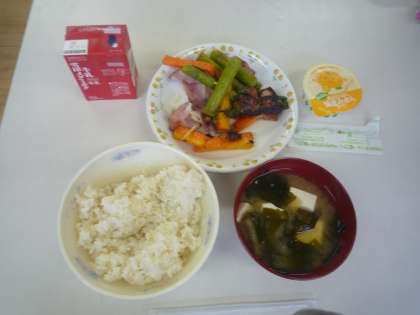 1班 野菜のベーコン巻とわかめと豆腐となすの味噌汁