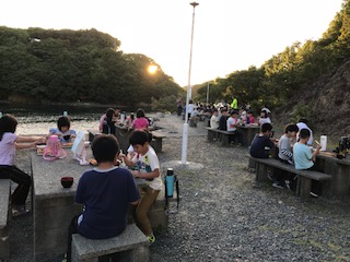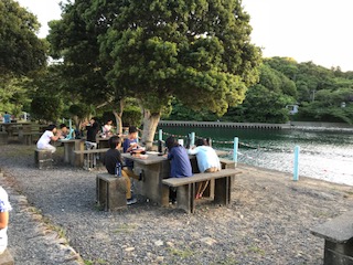 昼間は暑かったのですが,夕方になって心地よい風が吹いてきました。夕陽を見ながら2日目の夕食をいただきます。