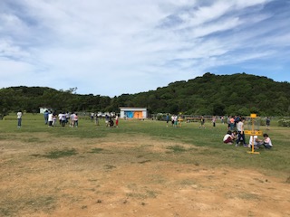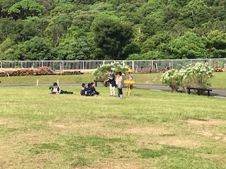退所式まで時間があるので,芝生広場で遊んだりくつろいだりしています。