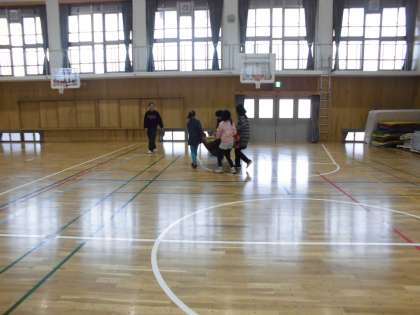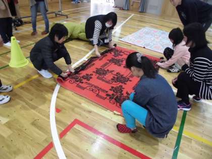 スポーツ部会では,「毛布で担架 タイムトライアル」をしました。怪我をした時に家にある毛布で担架を作り,怪我をした人を運びだすことができます。子ども達も挑戦しました。