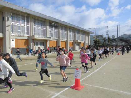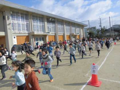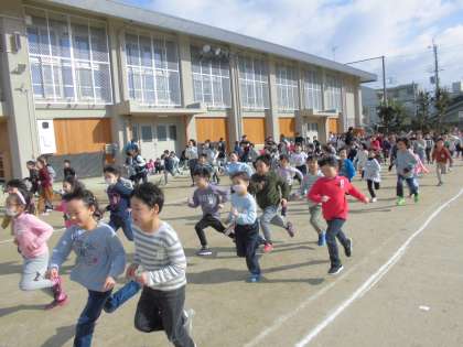 昨日はお天気がよくなくて実施できなかったのですが,今日はみんなで走ることができました。音楽が流れると子ども達は歩き始め,ウォーミングアップです。音楽が変わり,軽快な音楽になると,子ども達は一斉に走り出しました。