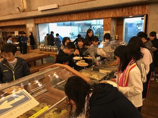 夕食の様子です。バイキング形式なので,自分でバランスを考えて盛り付けています。