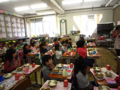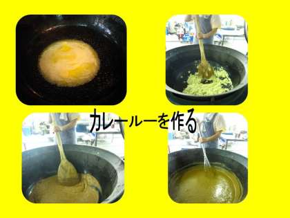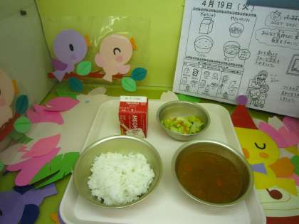 4月19日の給食は「ごはん、牛乳、カレー、野菜のソティ」です。カレーは給食の人気献立のひとつです。給食カレンダーを見て今日がカレーだということを子ども達は何日も前から知っています。その人気の秘密はいくつかあると思いますが、まず第一には、トロリとしたカレーを作るカレールーはインスタントのルーではなく、給食室の大きな鍋でバター、サラダ油、小麦粉、純カレー粉から作るルーにあります。最初はバターを溶かして小麦粉を炒めますが、白い小麦粉がだんだん薄茶色の小麦粉になり、濃い茶色になってきたら、純カレー粉と脱脂粉乳を湯で溶いたものを入れてカレールーを作ります。このルーを作るだけで1時間位かかります。他にもローリエやオールスパイス、ガーリックパウダー、などの香辛料でピリッと辛いカレーを作ります。1年生の教室では「給食のカレーは家より辛い」という声や「家のほうがもっと辛いよ」という声などさまざまでした。今日はカレーだけでなく、ごはんも野菜のソティも残すことなく食べていました。