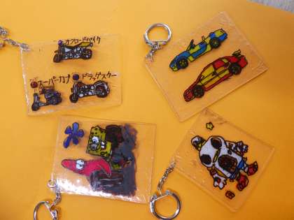 自分の好きなキャラクターやオリジナルの絵を描いて,プラ板作りをしました。お気に入りの絵の上に,プラスチック板を置き,丁寧に写していきます。毎日積み重ねているなぞる学習が役に立ち,上手に線をなぞれるようになりました。その線が消えないように,裏から色を塗りました。これも,以前なら線からはみ出してしまうことが多かったですが,丁寧に色を塗れるようになりました。できたプラ板に金具を付けると,世界に一つだけのキーホルダーができて,みんな大喜びでした。