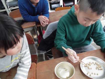 2月17日の「豆つまみ大会」に向けて特訓中です。60秒という時間制限があるためか,普段なら上手につまめるはずの豆が,うまくいかない…焦れば焦るほど箸から豆が逃げていく様に思える…そうこうするうちにタイムアップ…思わず悔し涙があふれる子もいたりして,練習とは思えない白熱ぶりです。