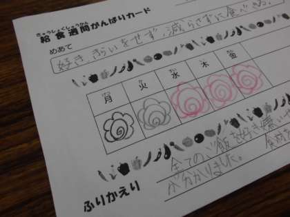 今週は給食週間でした。豆つまみ大会をしたり,給食室で給食ができるまでのようすをビデオで見たりしました。また,一人ひとりが自分の給食のめあてを決め,達成できるよう取り組みました。「時間内に食べる」,「残さず食べる」,「味わってよくかんで食べる」などいろいろなめあてがありました。