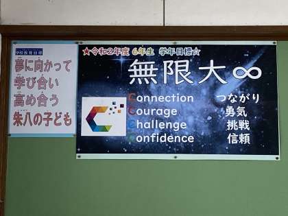 みんなに会う前に,3人の担任でみんなのことを思い浮かべながら,「どんな最高学年になってほしいか」を話し合いました。そのときに考えた学年目標を,それぞれの教室に掲示しました。