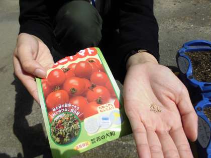 今日は,みんながチューリップをうえていたうえ木ばちに,ミニトマトのたねをまきました。