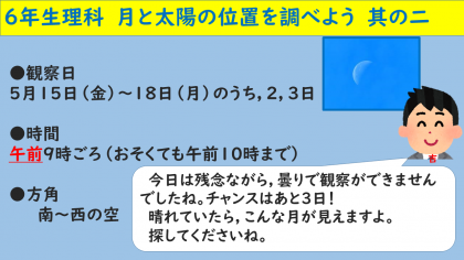 先生たちも,9時から10時のあいだ,何度も空の様子を確認しましたが,月の観察ができますようにという願いは,天には届きませんでした。