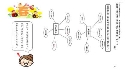 「春の楽しみ」「漢字の組み立て」の例をしょうかいします。きょうみのある人は,ほかの行事や漢字の部分も調べてみてください。