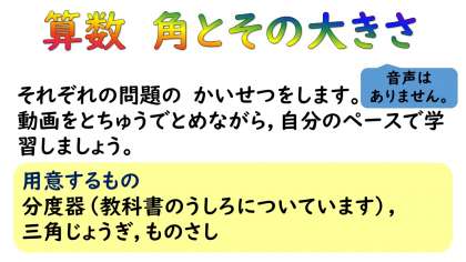 「角とその大きさ」は,動画を見ながら学習してみましょう。「わくわく算数」のサイトでも,教科書を使ったくわしい説明が動画でされていますので,こまったときは見てみてください。