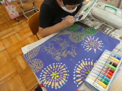 きや はっぱのいろを えのぐをまぜて つくりました。