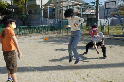 つるをなわとびのようにして,ひとりとびをしたり,おおなわとびをしたりしました。
