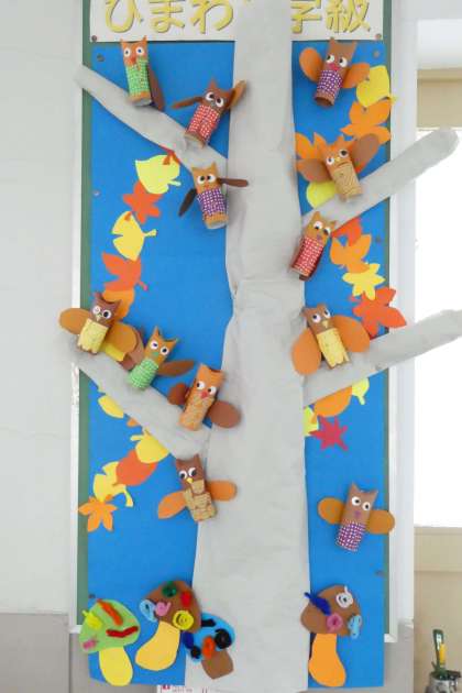 11がつは,いろづいたあきのはっぱとふくろうをつくりました。