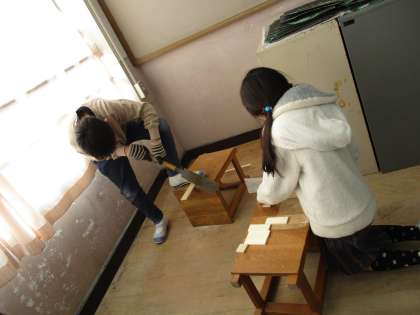 大きなのこぎりを使って木を切っています。足や手でしっかりと木を抑え,ずれないように工夫しています。何が出来上がるのでしょうか?