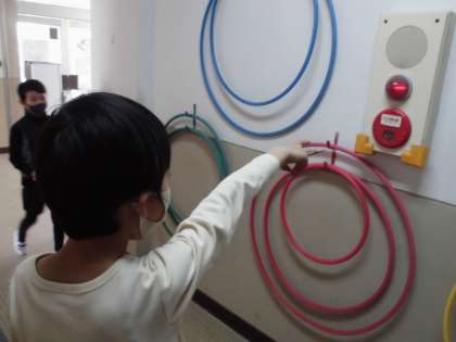 社会科の学習で,学校の中の消防施設を見つけに探検をしました。
