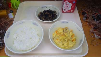 「ひじきまめがあまくておいしかったです。おやこにのたまごがふわふわしていて,おいしかったです。またたべたいです。」(3年児童)