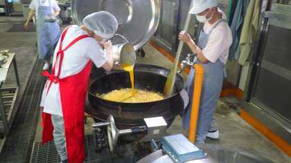 大きな釜2つで,卵がふわっと仕上がるように調理しています。