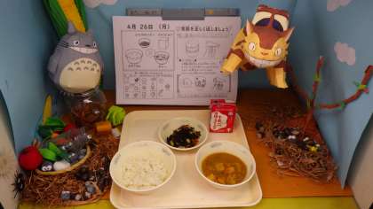 「カレーが野菜たっぷりでじゃがいもが一口サイズでおいしかったです。ひじきのソテーがシャキシャキしていておいしいです。」(6年児童)