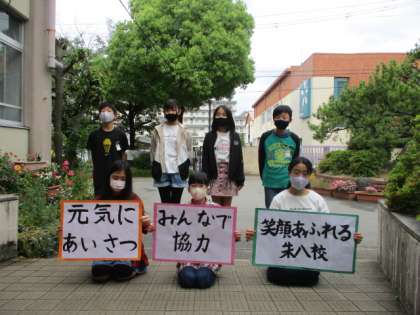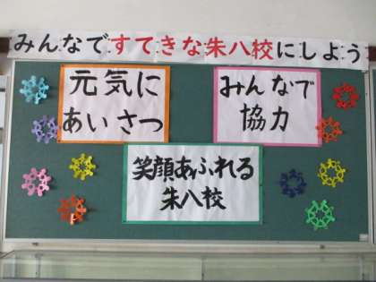 周りの人と元気よくあいさつし合うことや,みんなで協力し合うことを通して,笑顔あふれる朱八校をつくっていきたいと思います。