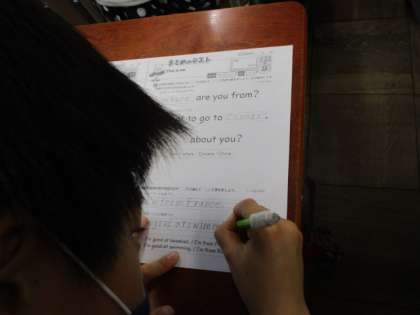 熱心に読みながら,お手本をなぞり,その後自分でも書いていました。