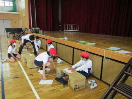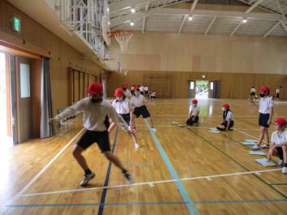 体育館で,ソフトボール投げを運動場で計測しました。
