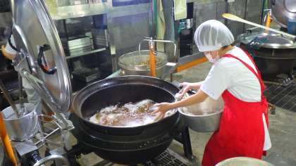 キャベツのごま煮のキャベツは,スチームコンベクションオーブンで蒸してから釜で炒め合わせ煮ました。キャベツの甘みがあり,とってもおいしかったです。
