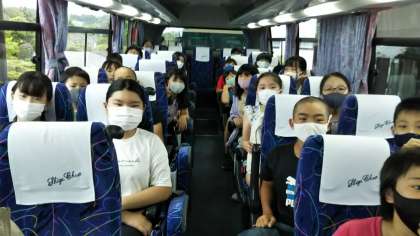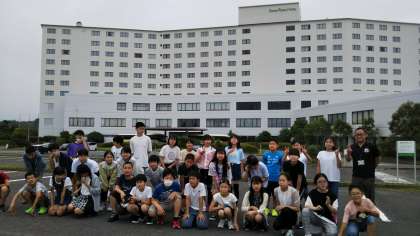 ホテルの前で記念撮影をして,お礼を言って出発しました。ホテルの前は,すぐ海でした。天気は曇りです。