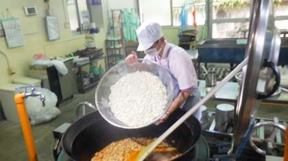 給食室では,たくさんのもやしを切ったり,ゆでたり,炒めたりしました。